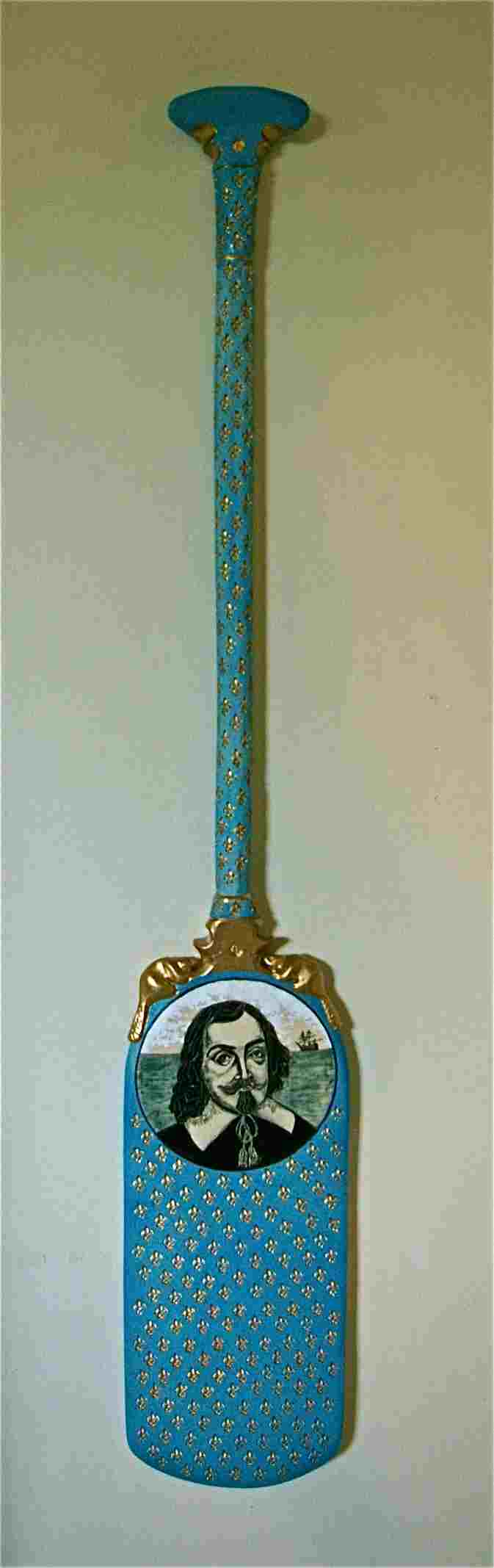 Keith Campbell. Artifact: The Samuel de Champlain Paddle. 125 cm L x 20 cm W x 4 cm D handbuilt and sculpted, stamped, stencil and painted, glaze with a clear glaze with stain under. Glued metal rods to join the 3 porcelain pieces together and gold paint. C/6 porcelain.