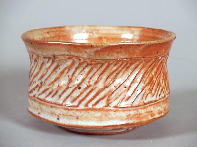 Wood fired carved bowl: 2005, 14cm. dia., 10cm. h., buff stoneware clay, shino style glaze. Again simple and probably influenced by Warren MacKenzie. The bowl has a concave waistwith the waist loosely cut out in diagonal strips. the glaze has settled as white into the grooves leaving the ridges orange coloured. Carbon trap is scattered throughout. The neck and the foot are each separated from the waist by a loosely incised line. The surfaces are casual unlike some of his other styles that can be tight, almost industrial in their perfection. The interior has the same glaze colour. In this style Alan keeps his work simple, easy and fast to make with minimal decoration. “No fuss, no muss.”