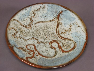 Wood fired platter: 2008, 45cm. dia., buff stoneware clay, iron kaki glaze, wax resist, celadon glaze and copper over glaze brushed on. This piece is part of an aerial landscape series depicting the Prairie landscape. In this case “rivers”. It is in the permanent collection of The National Craft Museum in Cheongju, Korea. Alan wanted to do the aerial drawings/paintings that sprung up from all his air travels sitting in the window seat. “I need to see where I’m going and also the views are incredible!”