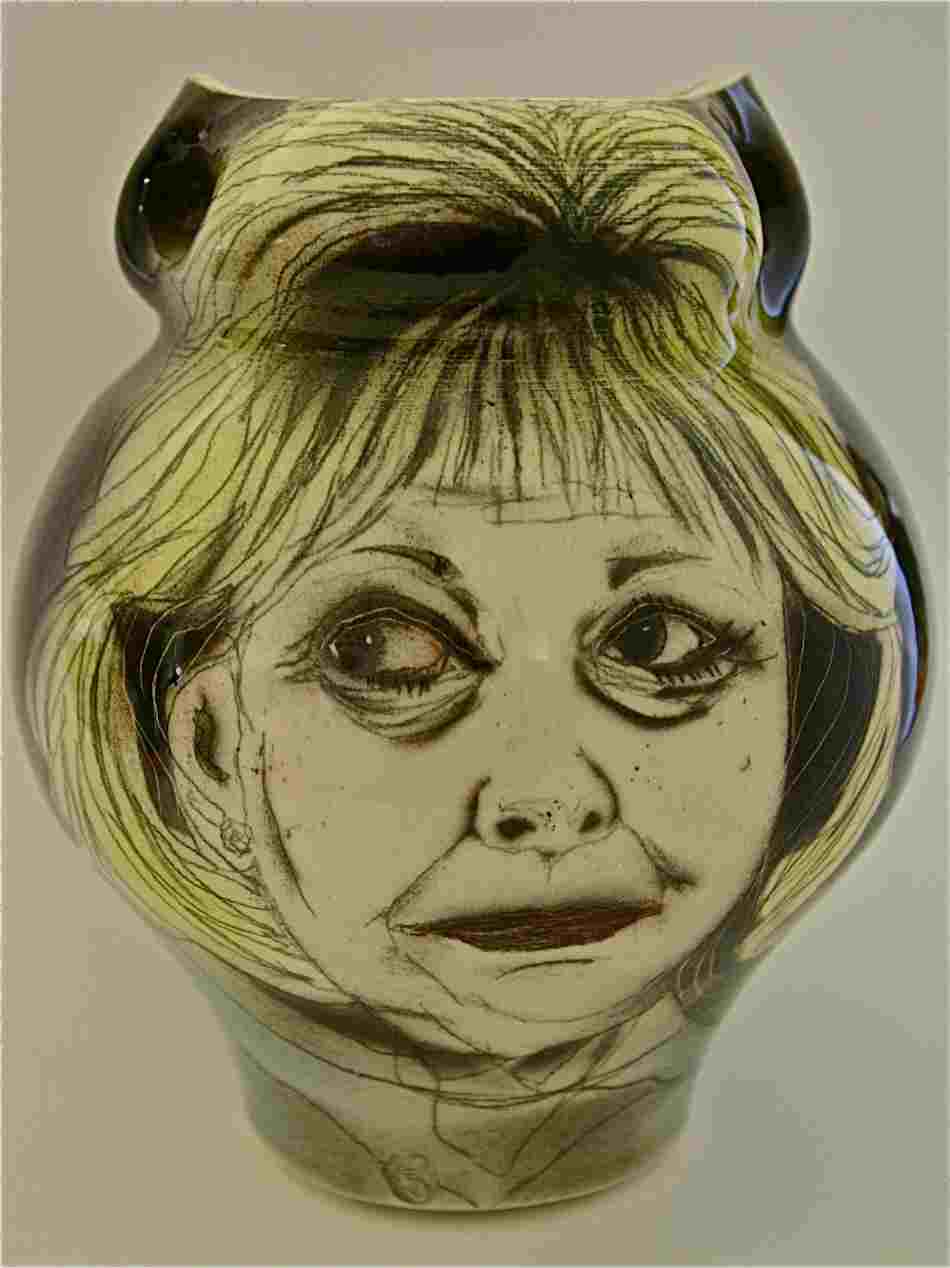 “Cat Woman of the Senate (Pamela Wallin) It is even darker humour. It is porcelain 20 cm high C/6 Porcelain, airbrush stencil, drawn with underglaze black pencil, sgraffito, sprayed with stains with clear glaze over. Only one glaze firing.