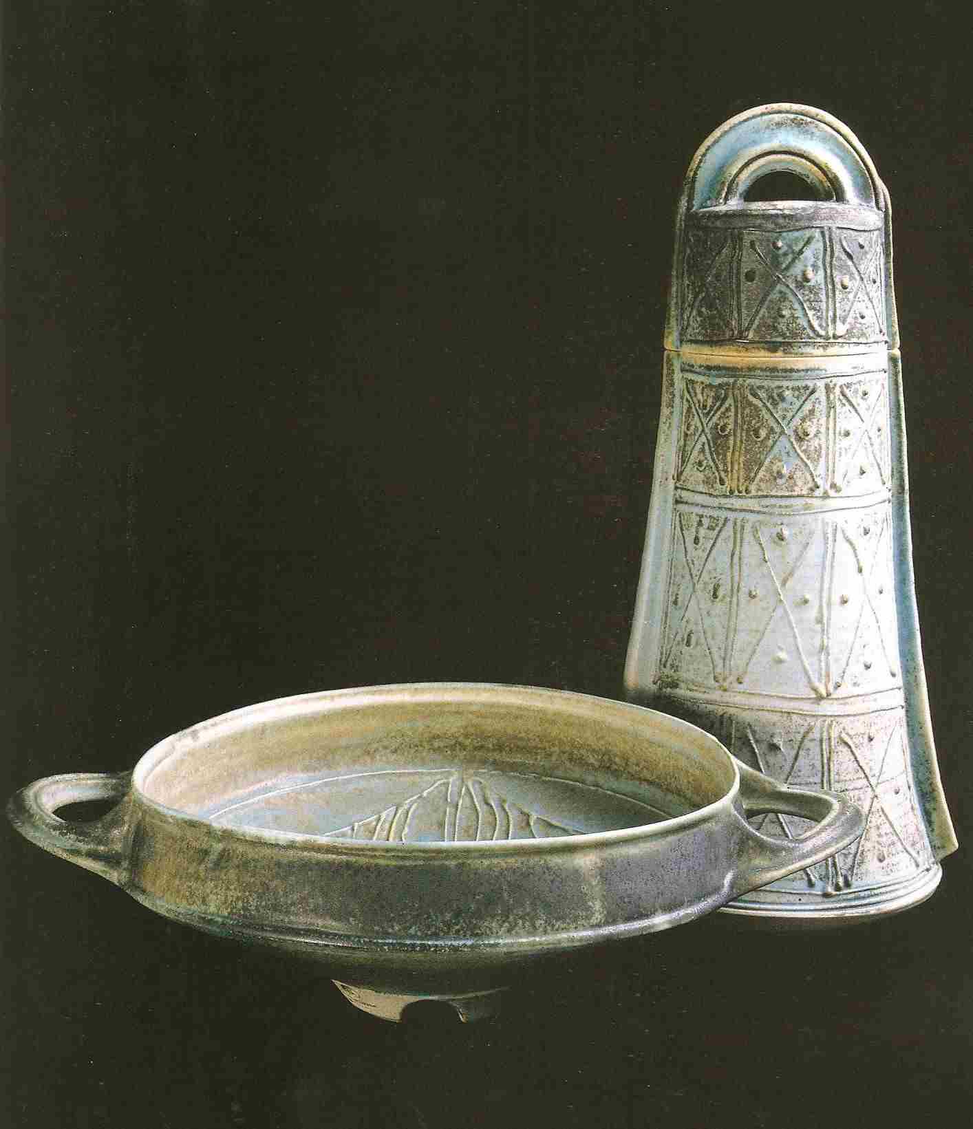 Robin Hopper. Lidded Bell Jar and Kylix Form. 1985. Thrown and constructed matte alkaline slip glaze over slip trailing, once fired oxidation cone 8. Jar 17? tall; Kylix 13? diam. Photo: Judi Dyelle.