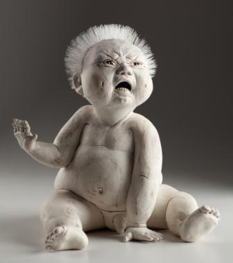 “One is immediately drawn towards Debra’s voluminous baby sculptures that kick and scream with fervent expression, figuratively silenced, and expertly captured mid-tantrum. Her use of wire and fish line to represent hair adds to the anguish in their mature facial expressions. … The baby is a significant metaphor because of our natural tendency to empathize with them. … Deborah uses the baby as a universal metaphor for the human world … serv[ing] as a reflection on our cultural tendency to overreact before thinking a situation through”. 4