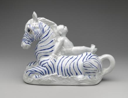 Equine Dreamboat, 2015. In recent years there is a new dreaminess, a reflection, a sympatico-oneness of humans with nature. Here Debra plays on the whiteness of porcelain to produce a harmonious compact, allegorical human and nature theme. A figure reclines lazily, cross-legged on the back of an uncomplaining, cobalt striped and zebra-like “sea horse.” The whole rests on a base of white sea foam. And there is the tail: Debra enjoys the delicate curve of the tail, that here extends more like some fragile tea cup handle.