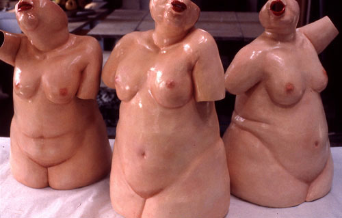 Ladies Night Out, 1985. Debra has produced a number of female torsos, especially in her early years. The torsos here are not flattering Hollywood types, nor idealized classical Greek goddesses. They sag and flow showing the effects of age and life. They shout and gesture like the Three Graces losing it on a night on the town that has gone out of control. Heads and limbs are frequently sliced off, moving the focus to the torso forms themselves.
