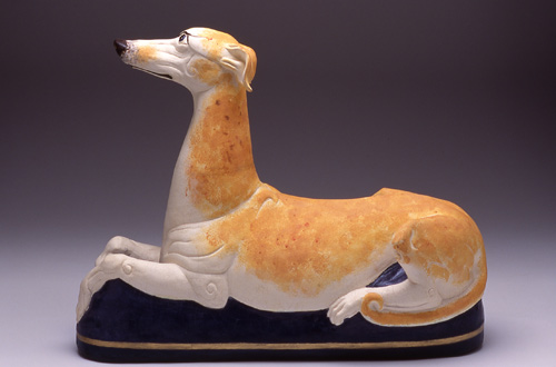 Hound Supersized, 2007. White clay, coloured slips, gersley borate, cone 3., L 53Cm H 38cm , Built as a solid form and then hollowed. 2nd International Exhibition for the Silicate Arts, Hungary, ICS Collection, Image in Technical #27 – Dogged Process, and in New Ceramics, Germany, Photo Kenji Nagai.