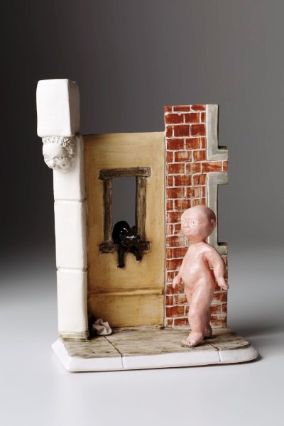 Window Watchers, 2013. (Or Hive). Stoneware clays, sands, and terra sigalattas, with porcelain figures. Slab and cutout, and small figures press-moulded, fired cone 10 reduction, H 38cm x L 51cm. Made at the ICS, collection of artist; 2014 Sculpture Calendar, Potters Council, USA.