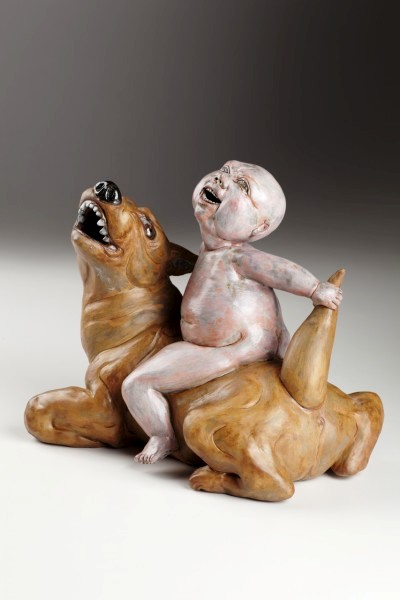 Face Lift, 2010. The whole effect is one of mass, density. There are no openings or piercings reaching out into space. The nature of clay, its mass and surface are the dominant forms. A baby stands front and centre before a patient bulldog, lifting up the flabby facial folds. The expressions in this case are quite reserved. The unusual juxtaposition of naked child with the fang-end of the dog produces an instinctive parental reaction in the viewer in the potential for danger. Yet there is no emotion or sense of threat on either part. The child’s face has a sense of infantile focus or purpose while the dog passively and patiently stares off into space as though this is a ritual performed a thousand times before.