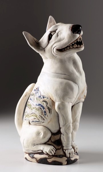 You Sly Dog, 2013. White midrange clay, H 56cm, slips, decals, slab built, , modeled Exhibited, One to Many, Burnaby Arts Council, 2013, Ceramics on the Edge, 2013. Private Collection. Photo Kenji Nagai.