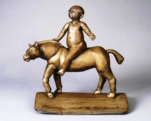 The Hamada work has a different feel. A bespectacled, naked Hamada sits astride a more weary, plodding horse that turns its head to the viewer, Hamada almost projects an air of arriving in triumph, disdaining to gaze out or connect with the viewer. That’s the horse’s job.
