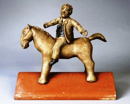 These are the first results of the renewed interest in horses. Inspired by equestrian roof tiles she saw in St. Ives, these works sit four square upon a base. The Leach work has a conventional, simple horse, but a clothed – business suited – portrait of Leach. Heads, arms, legs and tails extend into the four compass points as he turns to his left. The glazing is simple for its external, archititectural function. The effect in this early work is doll-like.