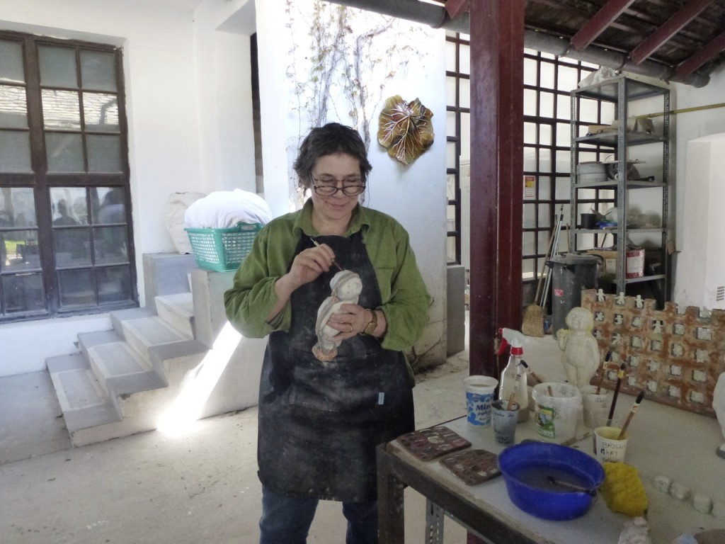 Debra will spend “two weeks making a baby form and then brushing on glaze, treating it like a pot”.¹ Sloan calls her use of moulds “still pretty primitive” because she only makes two-sided moulds, not twenty-piece moulds”, as many Hungarian students can do.¹ Press moulding and slip casting are preferred techniques. With press moulds she finds she can move the arms about and shift the head. Small gestures change the whole feeling of the piece. Slip moulding she says, “Is more prescribed”. ¹
