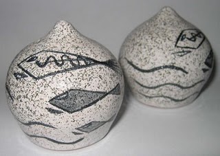Lorenzen. 1950s style salt and pepper shakers, with a speckly grey background and a handpainted design of stylised, angular fish. Bases inscribed ‘Lorenzen Lantz Nova Scotia’.