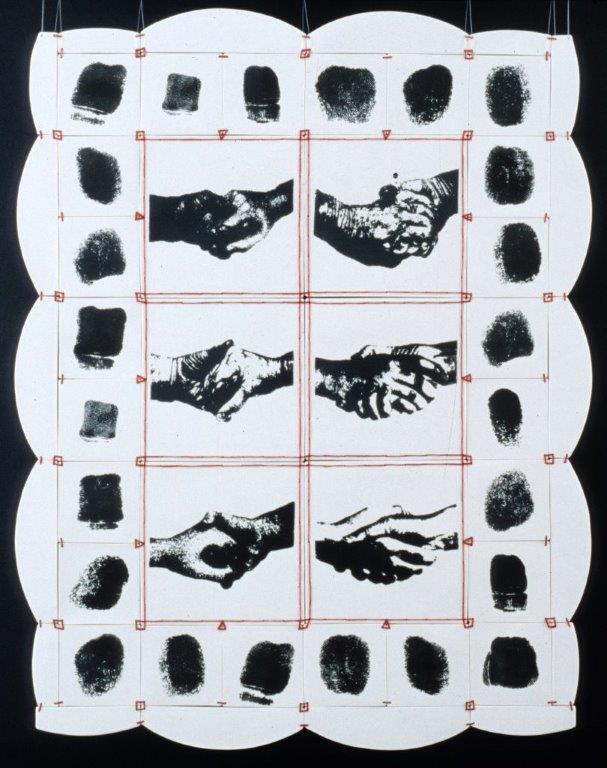 The Ties That Bind, 2000. Porcelain, embroidery floss, wooden dowel. Fired to Cone 10 in oxidation. 82 x 64 cm. This ceramic quilt was the first of the silkscreened images and the beginning of much more autobiographical work. The images are inter-generational, those of her mother, her daughter and herself. The fingerprints are also all theirs. The design and colour are simple and regular: black and white photo-silkscreened images with red thread outlines and corners, the whole softened by a scalloped border. Clasping hands and single finger prints define individuality, intimacy without fussiness. It was shown in the retrospective the Fabric of Clay, and in five other exhibitions, including Mothers/Daughters at the Mary E. Black Gallery in Halifax, which travelled to the Confederation Centre in PEI, and to the Acadia University Art Gallery in N.S. It was accompanied by four prints of their hands.2