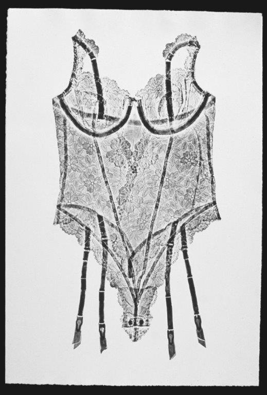 Underwraps 6, 2000. Relief print on paper. 76.5 x 51 cm. This was the last of the Underwraps series of monotype underwear prints. Although not ceramics, the more overtly sexual images of the series indicate the feminist themes McCurdy has been working on. She did six prints, each representing the underwear of a particular era, beginning with her grandmother, and ending with her daughter. The actual garments were stiffened, inked and put through a 300 pound printing press.