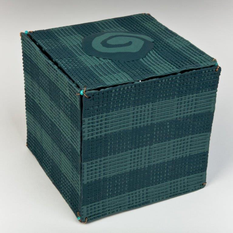 Green Spiral Box. 2009. Porcelain, (wire, beads as connectors) fired to Cone 9 in oxidation. 14 x14 cm. This box has no openings, but is a tweed, illustrating that yes, she can replicate weaving It is made the same way as the other boxes. The spiral symbolizes growth.2 Collection of the Beaverbrook Art Gallery, New Brunswick.