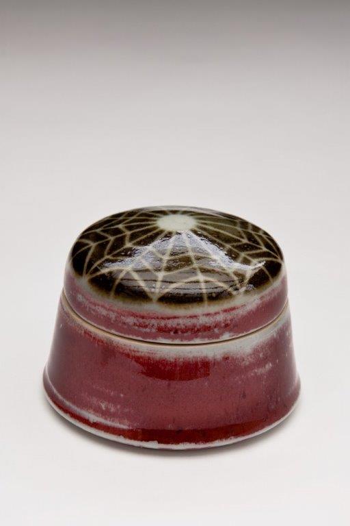 Copper Red Jewel Box, 1978. Porcelain, coloured slip, transparent glaze fired to Cone 10 in reduction. 6 x 7.5 cm. This is an early work before Alexandra found her voice in her later styles and symbols. These little “jewel boxes” were so named because they were placed in the kiln amidst large “oatmeal-coloured” glazed casseroles and bean crocks, so popular in those days with the other students. They were made at NSCAD when John Reeve was there teaching and were the beginning of decoration for her. She was interested in the colour and the depth of the glaze. The spider web top prefigures her weaving motifs of later years. Like much of her work these works are small, intimate in size, personal. Alexandra continues to create multi-coloured pastel-hued pieces in her production work, as seen in the portrait at the top of this page. Her later work is more monochromatic.