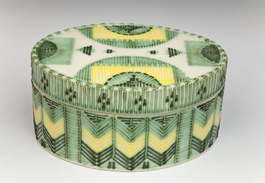 Green and Yellow Oval “Quillwork” Covered Box,1987. White stoneware, press molded, coloured underglazes and slips, transparent glaze, fired to Cone 5. 8 x 17 cm. This is another watershed piece, more directly fashioned after the native Indian quillwork using patterns similar to theirs. The designs had meaning in their work but she did not copy their actual patterns; rather, she created her own. At the time she was criticized for “appropriation” and stopped making them. Interestingly Emily Carr had her own personal ethical issues in using aboriginal motifs in her ceramics, but in the ethos of the times did not suffer the slight of “appropriation” that can be used so easily today. Soon after, Alexandra decided to do a Master’s degree at the Cardiff Institute of Higher Learning. Collection of Hugh Kierkegaard, Bedford, Nova Scotia.2