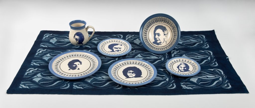 Blue: Chicago and Friends, 2009. White stoneware, coloured underglazes, transparent glaze fired to Cone 5. Emily Carr plate 1.5 x 22.5 cm; Judy Chicago plate 1.5 x 20 cm; Georgia O’Keefe mug 10 x 8 cm; Lucie Rie Bowl 5.5 x 20 cm; Barbara Hepworth plate 1 x 15 cm; Beatrice Wood plate 1 x 15 cm. Indigo dyed fabric 1987. Cotton fabric, 90 x 54 cm. This piece illustrates her women-artist-mentors, influenced by Judy Chicago’s Dinner Party. The images were silkscreened onto rolled out clay, cut in a circle and pressed onto the surface of the plate.2
