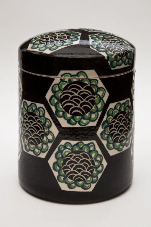 Black “Imari” Covered Jar, 1979. White stoneware, underglaze colours, transparent glaze, fired to Cone 5. 17 x 13 cm. This is an example of the work Alexandra was doing before she discovered women’s patterns as a key influence in her work.