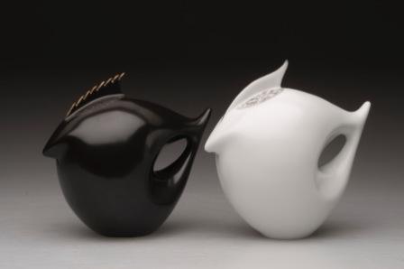Teacocks are a further variation in the bird forms of the series. The form suggests a function. By adding a comb near the “beak,” a lid and a cavity-handle near the tail they now became a teapot. Thus the name Teacocks. Initially the lids were loose, and there was a penetration just beneath the beaks for a liquid to exit. However, so many lids were broken by viewers handling them in exhibitions she eventually ended up permanently sealing the lid thereby removing its true function as a teapot. The works are not only typical of Ann’s exploring the possibilities of a form but also of her sense of humour.