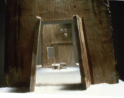 Lying Beyond the Limits of Ordinary Experience is one of two works with a rare figurative focus. A face emerges from the ground wrapped in a gauze-like shroud, mysteriously sepulchral. The work is bleak, like a vision of some nuclear-blasted landscape. The face is viewed through a door with a collapsing lintel; the door is framed by rough adobe-like bricks that hint of ages long past. In the background rests one of Ann’s spheres, viewing the scene like a sentinel of some galactic tragedy. The collective power of such works is powerful: a similarly-themed work shown at the Koffler Gallery in Toronto elicited the comment, ”It could only have been made by a survivor of the holocaust” 1