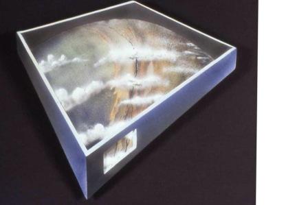 The plates, painterly trompe l’oeils, contrast with her other works. They are brightly coloured vistas of gardens, skies and landscapes. The surrounding “wall frame” is distorted, a skewed quadrilateral, angular compared to her usual softly curved forms. Originally the “walls” physically projected from the surface; later she flattened the entire surface. The effect is almost surreal, Magritte-like in effect. Unlike the rounded, tactile sensuousness of her bird/bud/fish and sphere forms these are flat, planar, visual, to be viewed but not touched, to tease the mind and eye. They are a play on openness and containment, space and flatness at the same time. The work, San Andreas Fault, is a double, visual play, not only with its atmospheric, spatial illusion but also because she uses one of her global sphere motifs within the image.