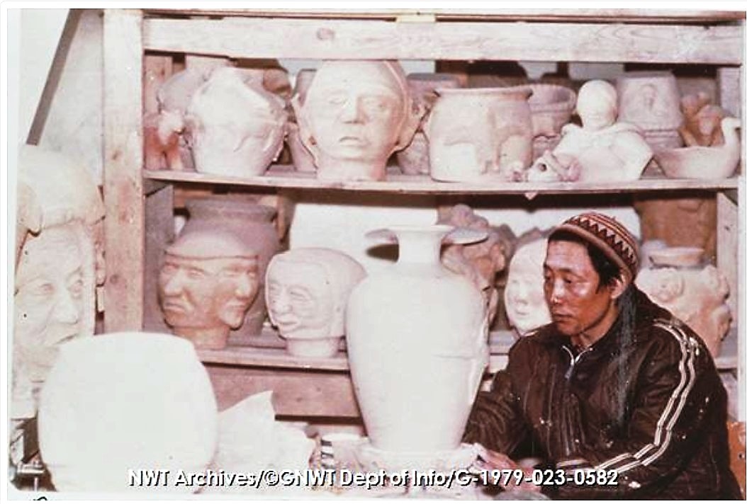 Ceramic shop, Rankin Inlet [man sits at table in pottery studio with large urn on pedestal, surrounded by large pots, heads and other figures on shelves ca. 1971]. CREDIT: NWT Archives/Northwest Territories. Department of Information fonds/G-1979-023: 0582. From the holdings of the NWT Archives.