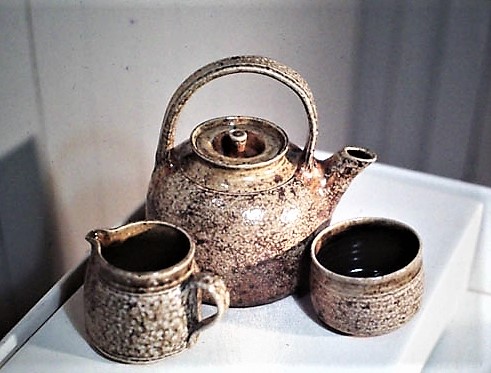 Pam Teapot 1974 (2) ← Previous Next → Pam Birdsall, 1974, Teapot with Cream and Sugar, Cone 10 Stoneware, salt glazed with ash glaze.