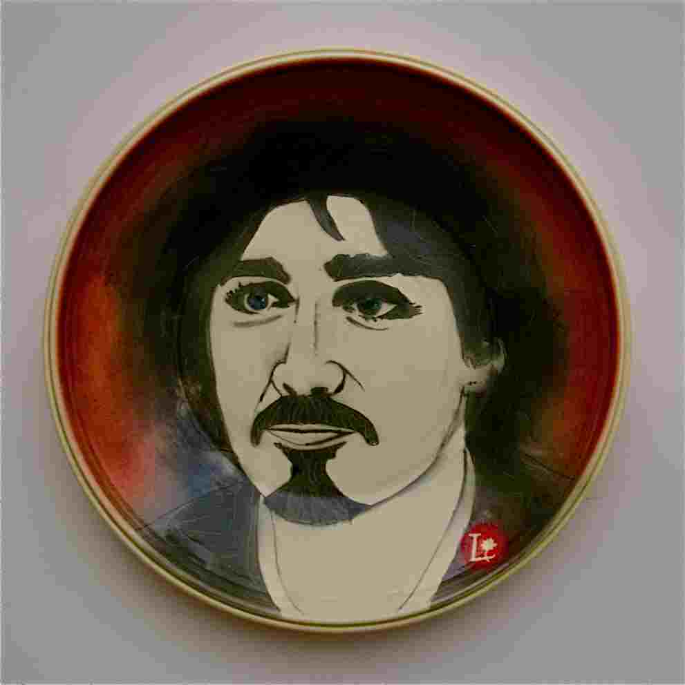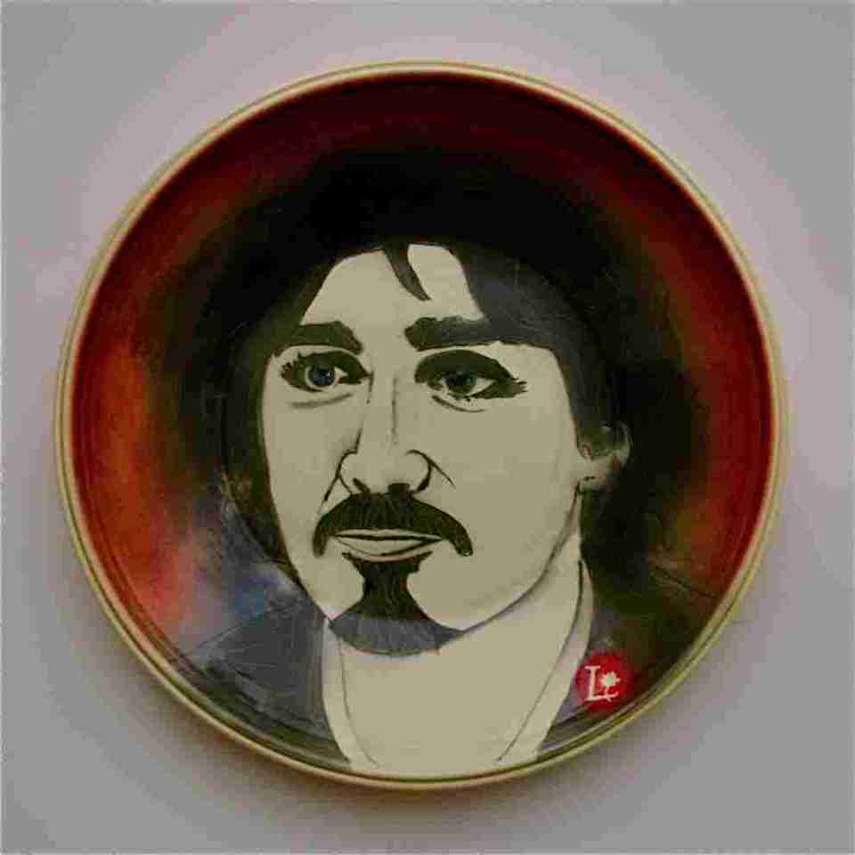“Rebel With A Cause”. It is Justin Trudeau with his Rebel image before he became clean cut. I loved this image because it reminded me of the 1800’s. The plate is 33 cm wide by 4 cm deep. Thrown porcelain with photo stench, drawn and painted image Stains airbrushed with clear glaze over fired to C/6. On glaze black and gold lustre fired to C/015.