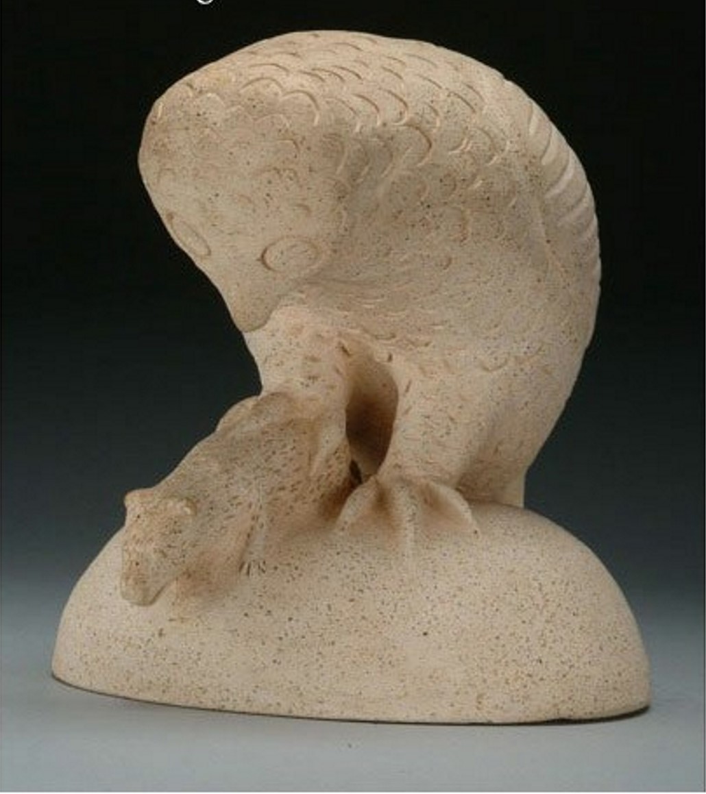 A ceramic figure of an owl holding a small animal in its talon